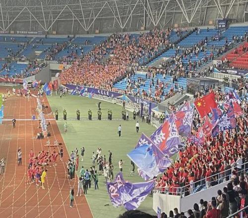 比赛结束后,仍有盐城球迷意犹未尽,久久不愿离去,站在看台上挥舞小旗帜,为球队加油。