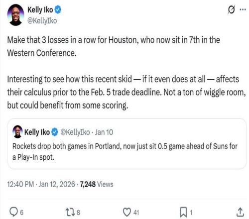 队记Kelly Iko赛后直言遭遇3连败后跌至西部第七,可能会让火箭队改变策略,重新考虑在2月份交易截止日前有所行动。