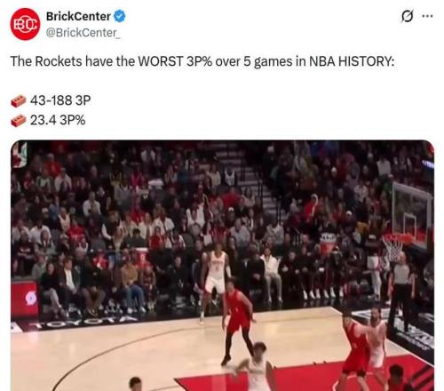 过去5场火箭三分合计188中43,命中率只有23.4%,创造NBA连续5场比赛三分命中率最差纪录。