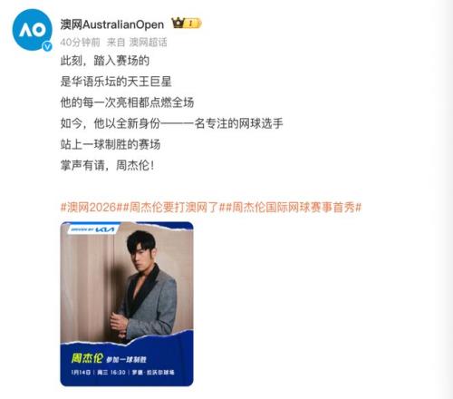 北京时间1月12日,澳网官方宣布:周杰伦将参加2026年澳网“一球制胜”,这也将是周杰伦的国际网球赛事首秀。